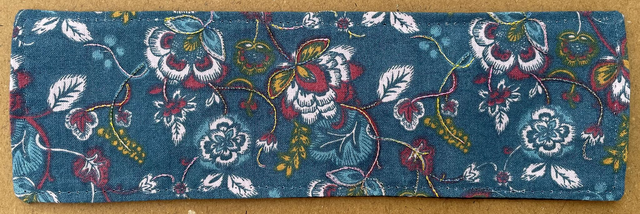 Marque-page brodé d'une citation de Molière au recto. Tissu imprimé dont les motifs ont été rehaussés d'une broderie à l'aiguille au verso. 200 x 60. Photos supplémentaires sur simple demande.