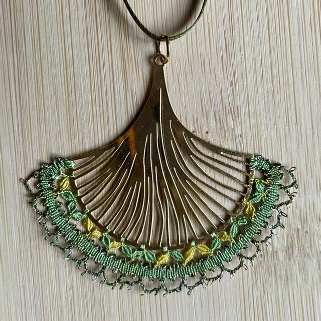 Pendentif entièrement fabriqué dans notre atelier (du dessin à la conception) selon la technique de la dentelle aux fuseaux. La dentelle, réalisée en coton vert et fil métallisé nuancé et argenté, est crochetée sur une estampe en métal doré. Dimensions : hauteur 5 cm (ferrure comprise) / largeur 5,5 cm.