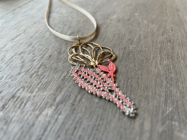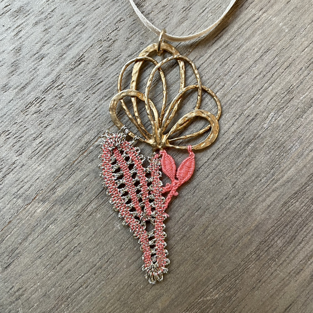 Pendentif entièrement créé dans un notre atelier (du dessin à la conception) selon la technique de la dentelle aux fuseaux. Réalisées en coton orangé et fils métallisé rose, la dentelle est crochetée sur une estampe en métal doré. Dimensions : hauteur 5,3 cm (ferrure comprise) / largeur 2,5 cm. Le pendentif se porte au choix (voir les options) sur un cordon réalisé à la main selon la technique japonaise du Kumihimo (délai supplémentaire) soit sur un ruban de satin. Il est livré avec sa pochette cadeau (la couleur de la pochette peut changer en fonction du stock). Pièce unique - Handmade.