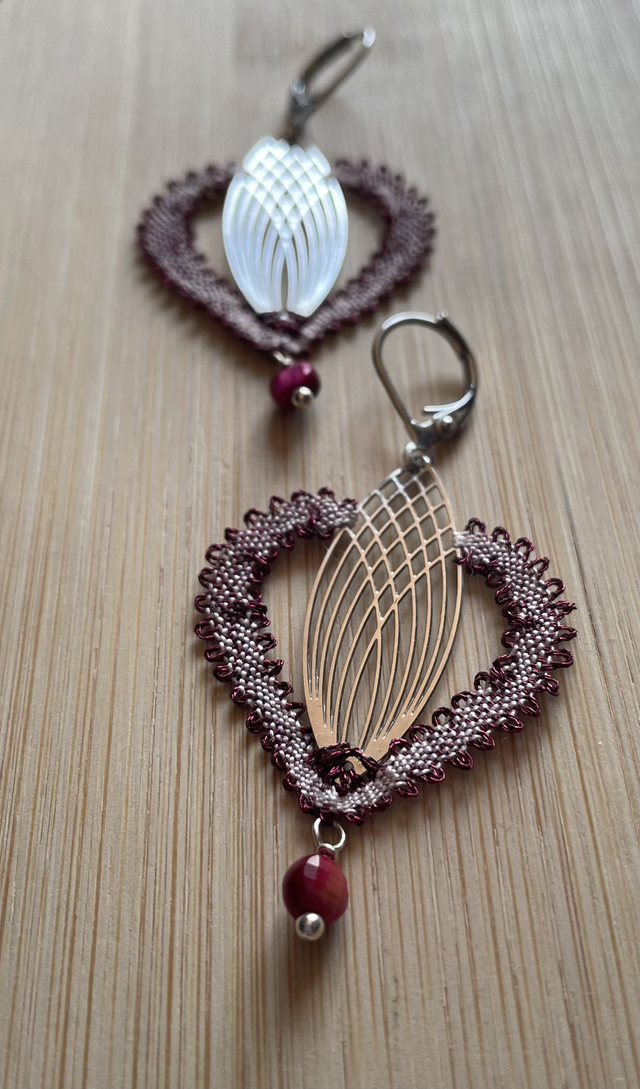 Boucles d'oreilles entièrement réalisées dans notre atelier (du dessin à la conception) selon la technique de la dentelle aux fuseaux. Légèreté et finesse caractérisent ces boucles d'oreilles réalisées en rose pâle et fil métallisé bordeaux. La dentelle est montée sur une ferrure argentée et agrémentée d'un oeil de tigre bordeaux. Dimensions : hauteur 5,5 cm (ferrure comprise) / largeur 3 cm.