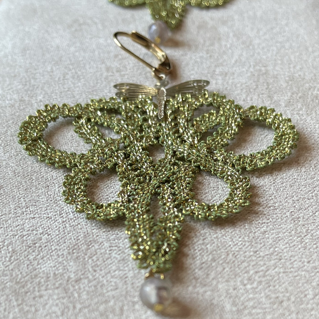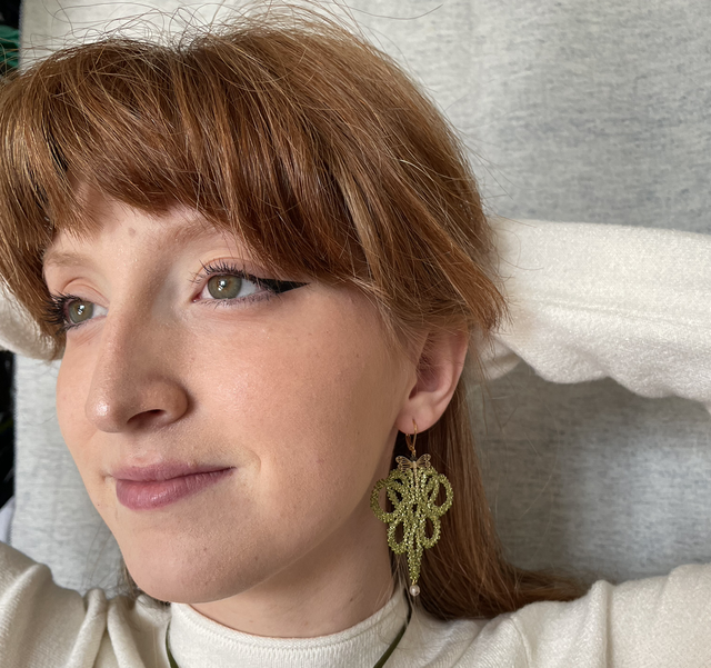 Boucles d'oreilles entièrement réalisées dans notre atelier (du dessin à la conception) selon la technique de la dentelle aux fuseaux. Légèreté et finesse caractérisent ces boucles d'oreilles conçues en coton nuancé vert et fils métallisé vert et doré. La dentelle est montée sur une ferrure dorée et agrémentée d'une agate.