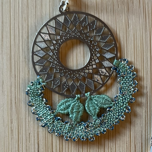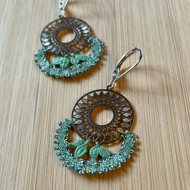 Boucles d'oreilles entièrement réalisées dans notre atelier (du dessin à la conception) selon la technique de la dentelle aux fuseaux. Légèreté et finesse caractérisent ces boucles d'oreilles conçues en coton vert d'eau et fil métallisé argenté. La dentelle est montée sur une ferrure argentée.