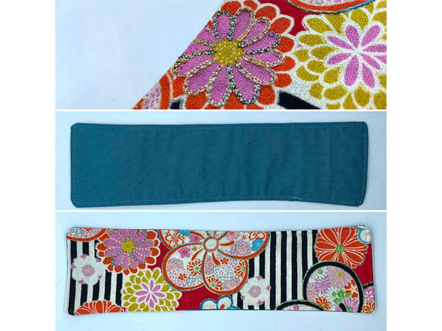 Marque-page en tissu japonais imprimé dont les motifs ont été rehaussés d'une broderie à l'aiguille. 197 x 53.