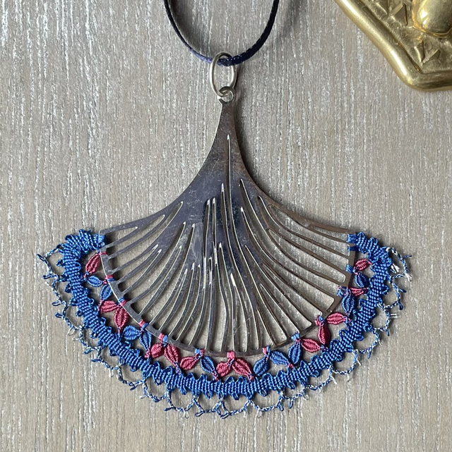 Pendentif entièrement fabriqué dans notre atelier (du dessin à la conception) selon la technique de la dentelle aux fuseaux. La dentelle, réalisée en coton bleu et prune et fil métallisé bleu et argenté, est crochetée sur une estampe en métal argenté. Dimensions : hauteur 5 cm (ferrure comprise) / largeur 5,5 cm. Le pendentif se porte sur un ruban de satin noir. Il est livré avec sa pochette cadeau (la couleur de la pochette peut changer en fonction du stock). Pièce unique -